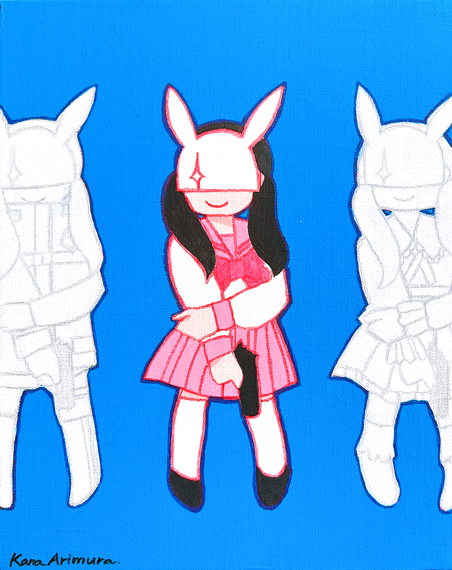 2017年からウサギの仮面をつけた女性をモチーフにした絵を中心に描き、『現代を生きる乙女の生と死』の表現に取り組んでいる。絵に登場する人物の目が隠されている。「果たしてこの人物はどんな表情をしているのか?どんな思想を持っているのか?」と鑑賞者に考察してもらうことで、一枚絵として完成すると考えている。夢も、ファンタジーも、狂気も、毒も、頭に浮かび上がったものは、自分にとってのリアル。乙女と世界と生と死と日常を描く。